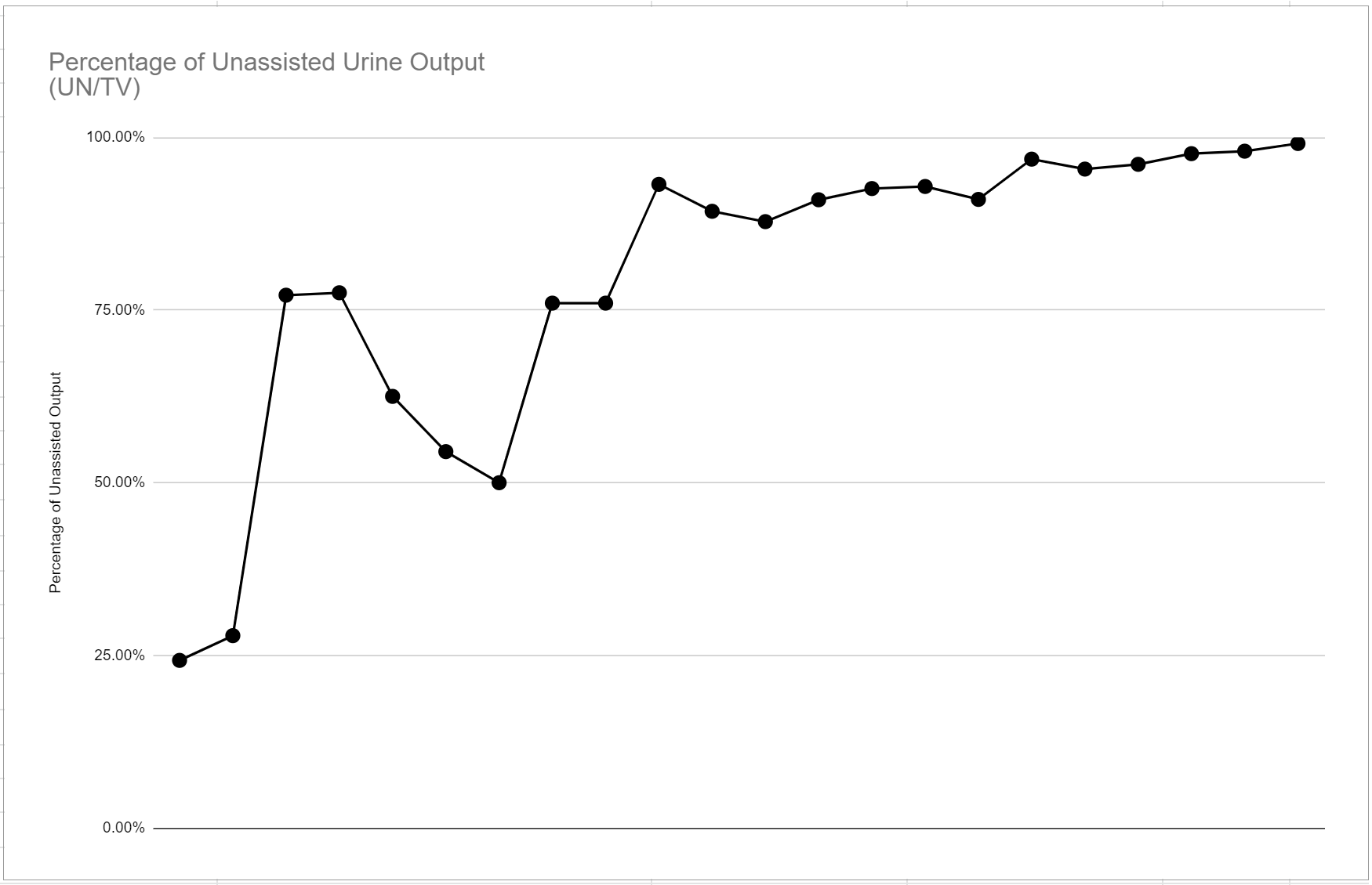 Percentage of Unassisted Urine Output is calculated by Unassisted urine output(UN)/Total Volume of Urine(TV)   x   100%